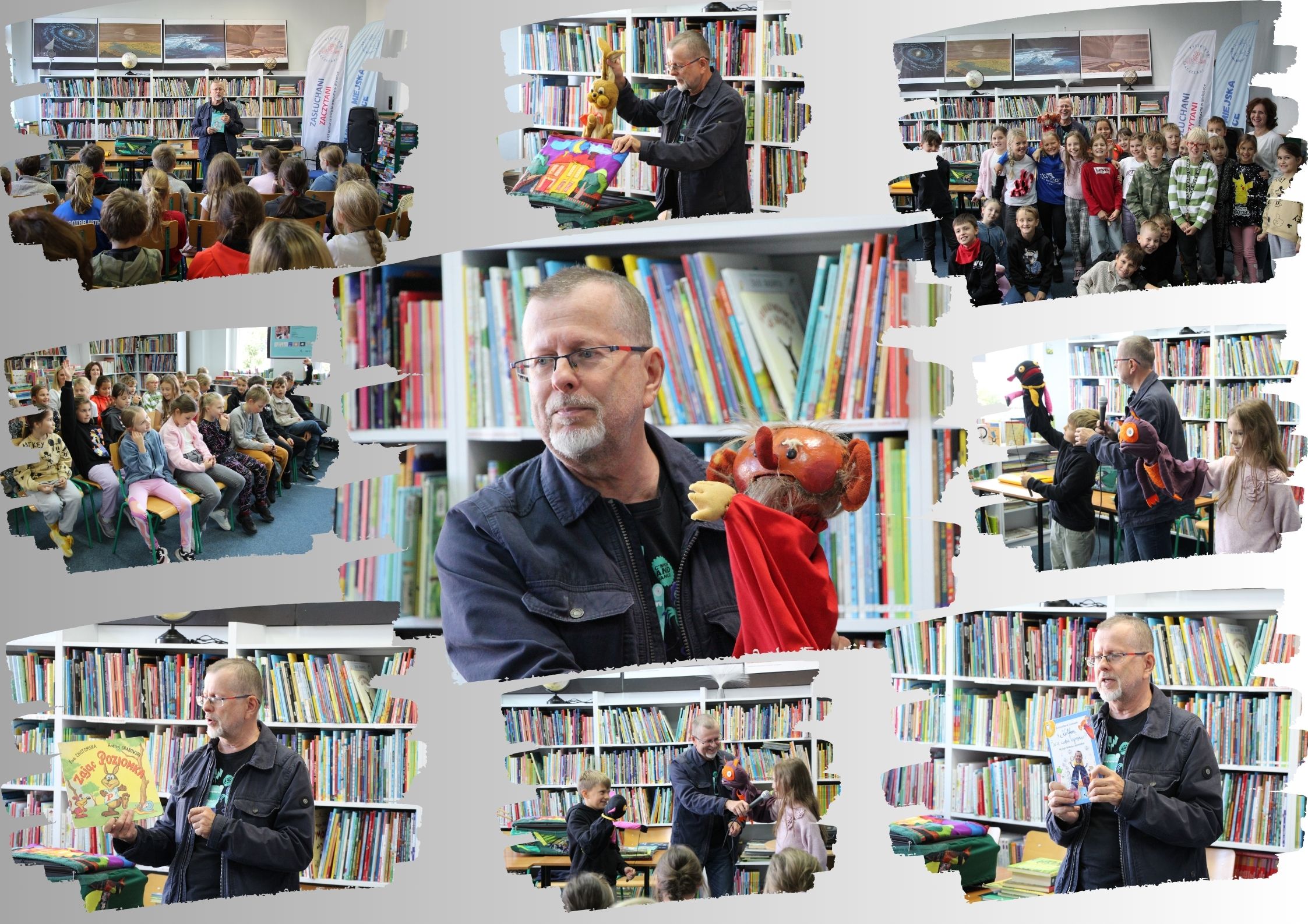 Pisarz odwiedził dzisiaj naszą bibliotekę. Oczarował dzieci czytając im fragmenty swoich książek i opowiadał historie, które pojawiają się w jego książkach. Poznaliśmy małą Kasię, której największym marzeniem było posiadanie kochanego pieska. Pewnego dnia Kasia odnalazła w śmietniku małego kundelka... czy mogła go zatrzymać?. Tego możemy się dowiedzieć z książki "Instrukcja obsługi pieska Jacósia". O wojennych doświadczeniach matki pisarza opowiada książka "Wojna na Pięknym Brzegu", jedna z najbardziej ulubionych dzieł Pana Andrzeja. Duże zainteresowanie wśród dzieci budziła "magiczna walizka" gościa. Okazało się, że są w niej ukryte postacie Kulfona, kota Budzika oraz potworków Bezkajku i Szefuncia. Uczniowie mieli okazję sami "ożywić" bajkowe postacie potworków i wcielić się w rolę aktorów.