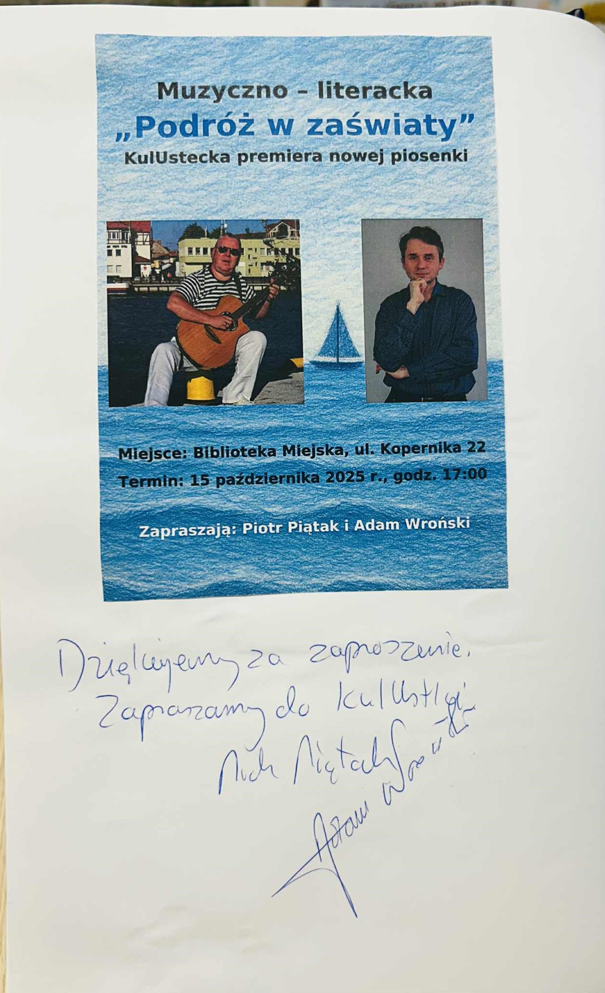 To już z resztą się dzieje. Pierwsze efekty takiego partnerstwa poznaliśmy wczoraj. Swoją odsłonę miała piosenka pana Adama Wrońskiego i pana Piotra Piątaka. Inspiracją kompozytorską dla usteckiego wokalisty była właśnie najnowsza książka inicjatora KulUstki "Podróż w zaświaty. Powołanie Zodiasza". Powieść z gatunku fantasy będzie miała swoją kontynuację, a jej pierwsza część dostępna jest w naszej Bibliotece. Zapraszamy!